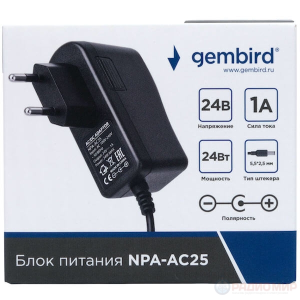 Сетевой адаптер 24V, 1А, 24W. Негерметичный пластиковый корпус IP20. Защита от перегрузки.