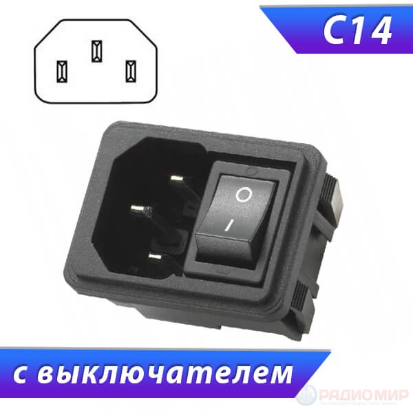 Панельный разъём питания C14 с клавишным выключателем ON/OFF. Надежное подключение 220 В, монтаж на защёлках, пластиковый корпус, 10 А, 250 В.
