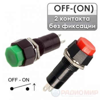 В исходном состоянии контакты кнопки разомкнуты, при нажатии замыкаются. Без фиксации. Крепится кнопка в отверстии на панели при помощи резьбы. Подключение контактов производится с помощью пайки, плоских клемм или под винт.