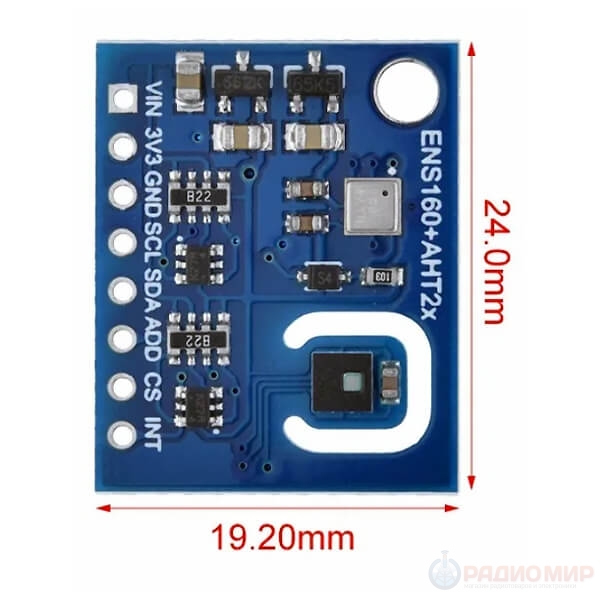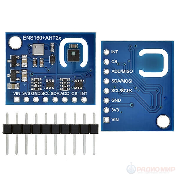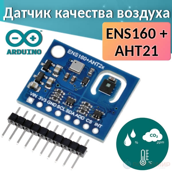 ENS160 + AHT21 — цифровой многофункциональный датчик для оценки качества воздуха в помещениях. Он объединяет в одном модуле два высокоточных сенсора: ENS160 (газовый сенсор для CO₂ и TVOC) и AHT21 (датчик температуры и влажности).