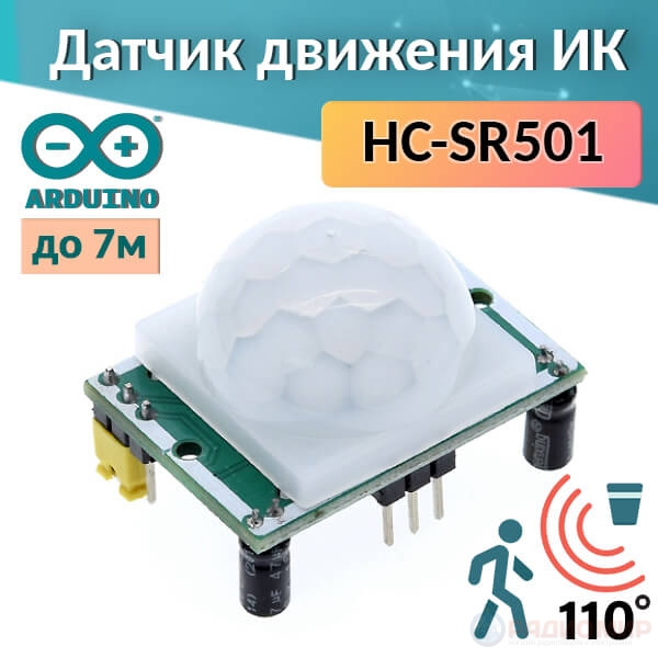 HC-SR501 — инфракрасный PIR датчик движения для Arduino и других микроконтроллеров. Обнаруживает человека и домашних животных до 7 м. Два режима срабатывания, регулируемая дальность и время задержки.