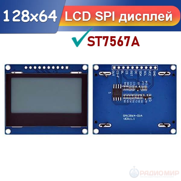 Графический LCD модуль ST7567A 128x64 SPI. Контроллер ST7567A (COG), подсветка на белых светодиодах, питание 3.3–5В, размеры 47×40 мм. Подходит для Arduino, STM32, ESP32 и других микроконтроллеров.