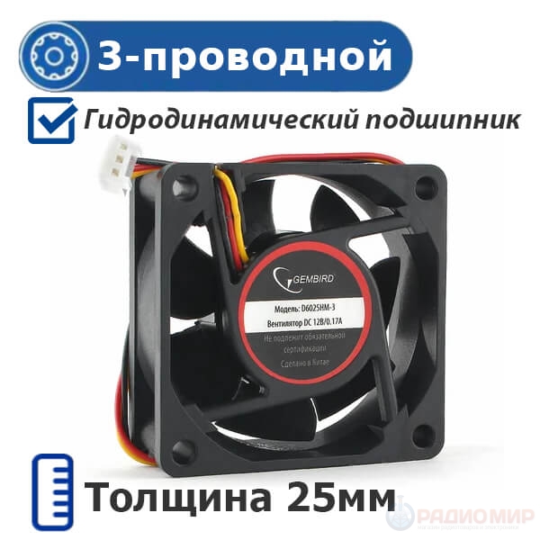 | D6025HM-3 | Гидродинамический (HDB) | 60×60×25 | 4000 | 20.2 | 32.5 | 0.18 | 3-pin | 25 см |
