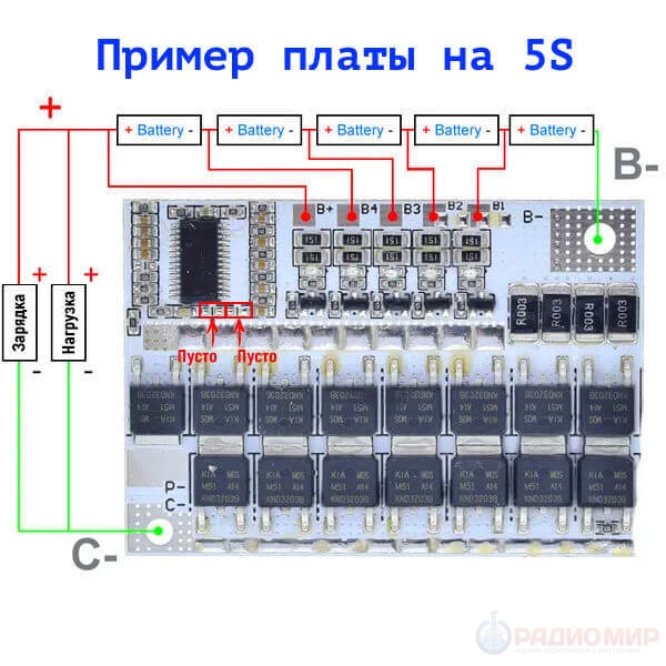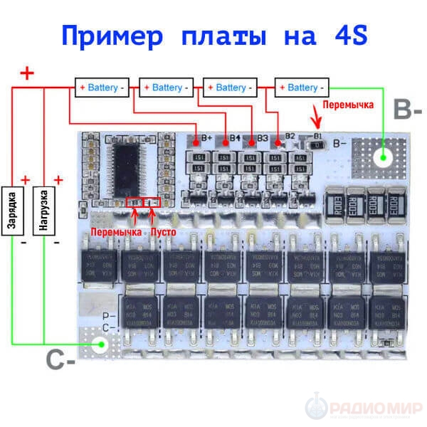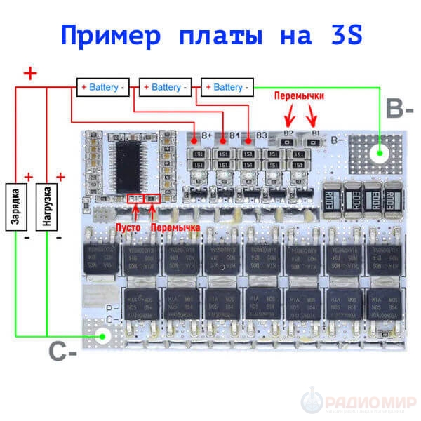 ► Плата универсальная и будет работать с 3S или 4S Li-ion аккумуляторами. Простая переделка под 3S, 4S или 5S путём установки перемычек (см. фото).