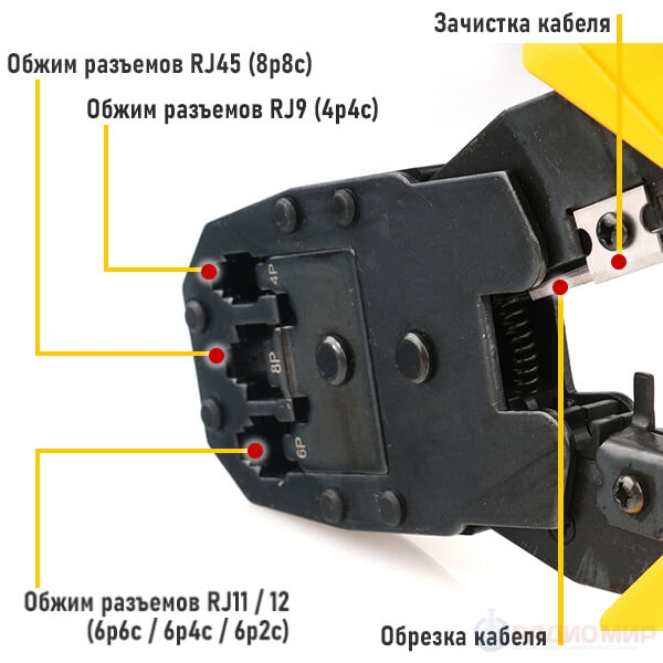 - Совместимость с коннекторами RJ45, RJ12, RJ11, RJ9.