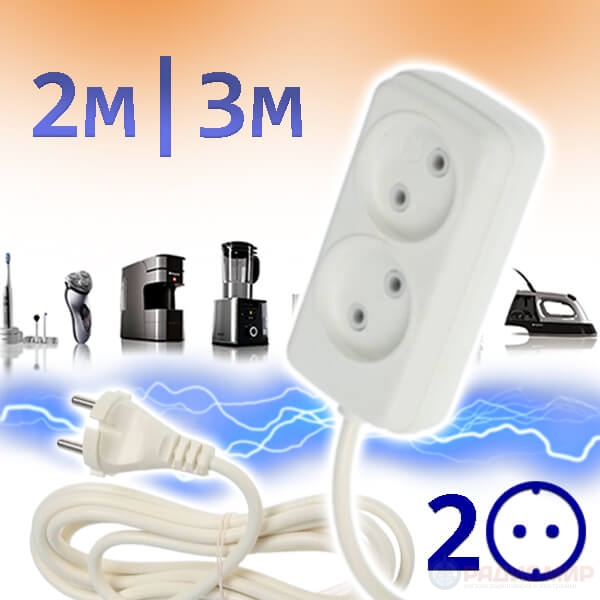 Электрический удлинитель РС-2 предназначен для подключения бытовых и офисных электроприборов к электрической сети 220 В. Корпус выполнен из прочного пластика, а провод типа ПВС 2×0.75 обеспечивает надёжную подачу питания. Выпускается в двух вариантах длины — 2 м и 3 м. Изделие произведено в России.
