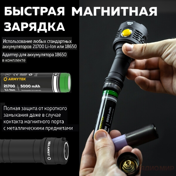 - Магнитная USB-зарядка + аккумулятор 21700 Li-Ion 5000 мАч в комплекте.