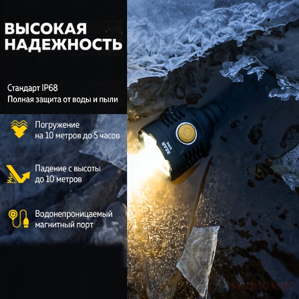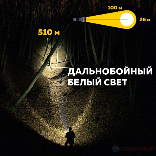 - Дальность белого луча 510 м — настоящий дальнобой.