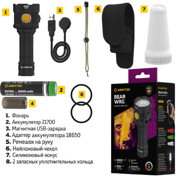 Armytek Bear WRG — мощный универсальный фонарь 3-в-1 с белым, красным и зелёным светом, разработанный для повседневного использования, активного отдыха, охоты, рыбалки и профессиональных задач. Позволяет эффективно освещать как удалённые объекты, так и пространство рядом с пользователем. В комплекте идёт силиконовый конус, обеспечивающий всенаправленный мягкий свет — идеален для палатки, кемпинга или подачи сигнала.