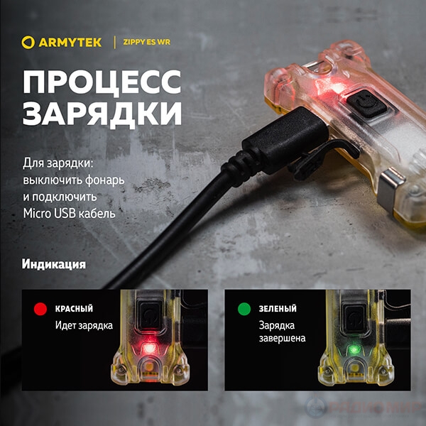 Зарядка через Micro-USB от любого источника. Время зарядки зависит от источника питания (см. инструкцию производителя).
