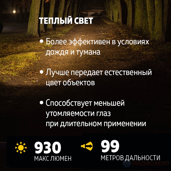 Холодный Белый даёт максимально высокий световой поток — до 1000 лм, выглядит ярче и контрастнее. Тёплый Белый выдаёт 930 лм, лучше пробивает туман, дождь, снег и даёт более комфортное восприятие глазу.