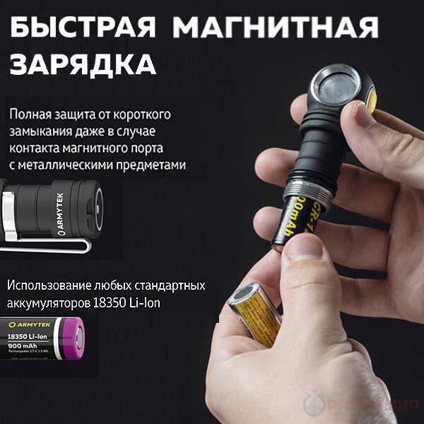 Обе версии работают от аккумулятора 18350 Li-Ion. Зарядка осуществляется через магнитный USB-интерфейс.
