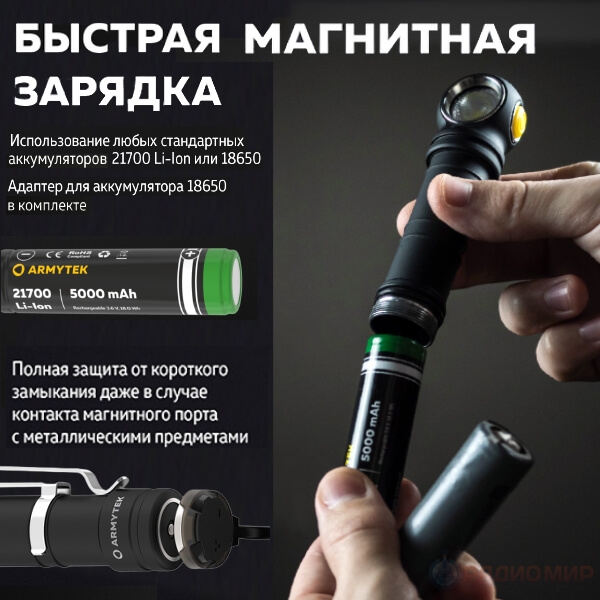 - Совместимые аккумуляторы: 1×21700 Li-Ion, 1×18650 Li-Ion (с адаптером)