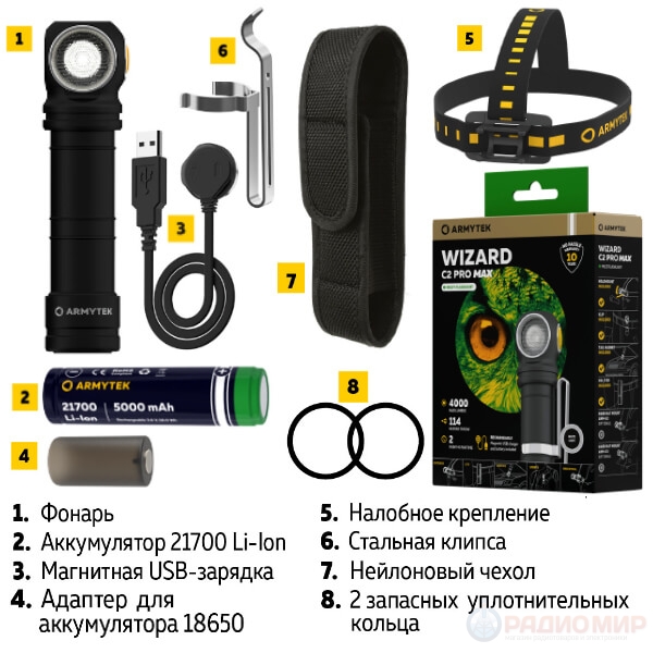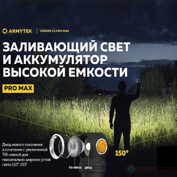 Мощный налобный и ручной фонарь Armytek Wizard C2 Pro Max Magnet USB — до 4000 лм (White) или 3720 лм (Warm), стабилизированный свет, 6–10 режимов, магнитная зарядка, IP68, падения 10 м, работа до 62 дней. Подходит для туризма, работы и EDC.