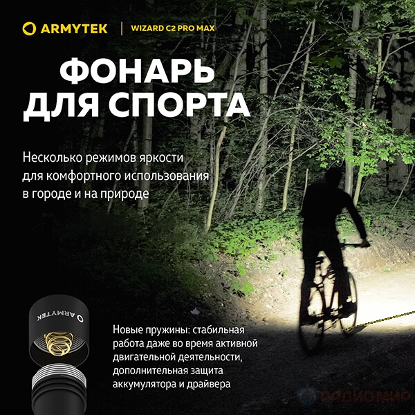 Armytek Wizard C2 Pro Max Magnet USB — один из самых ярких мультифонарей бренда с мощностью до 4000 люмен. Модель создана для работы на максимуме возможностей: полноценная стабилизация яркости, магнитная зарядка USB, 6 режимов простого управления и до 10 режимов расширенного. Идеальна для работы, активного отдыха, EDC и спорта.