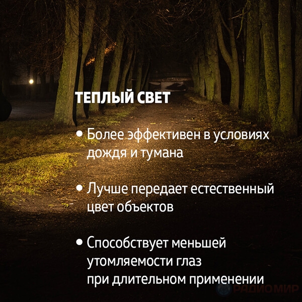 - Оптика: рефлектор, центральное пятно + боковая засветка (5° : 40°).