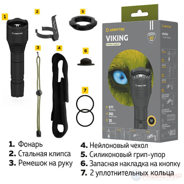 Фонарь Armytek Viking Warm White: 977 лм, дальность 350 м, до 12 дней работы. Тактический, ударопрочный, IP68. Подходит для 1x18650 или 2xCR123A.