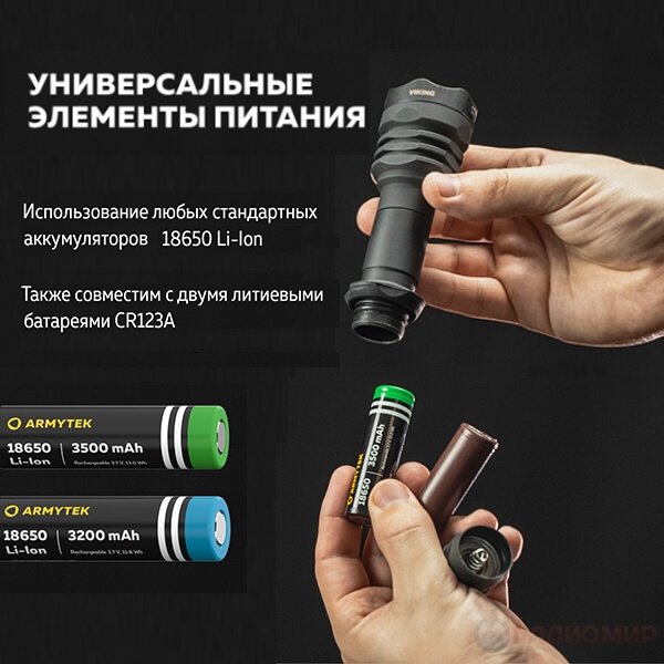 | Питание | 1×18650 Li‑Ion или 2×CR123A (в комплект не входят) |