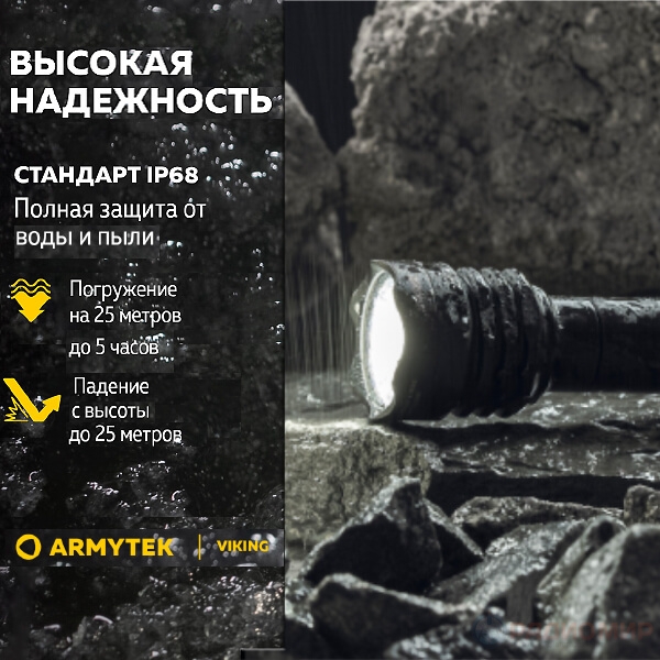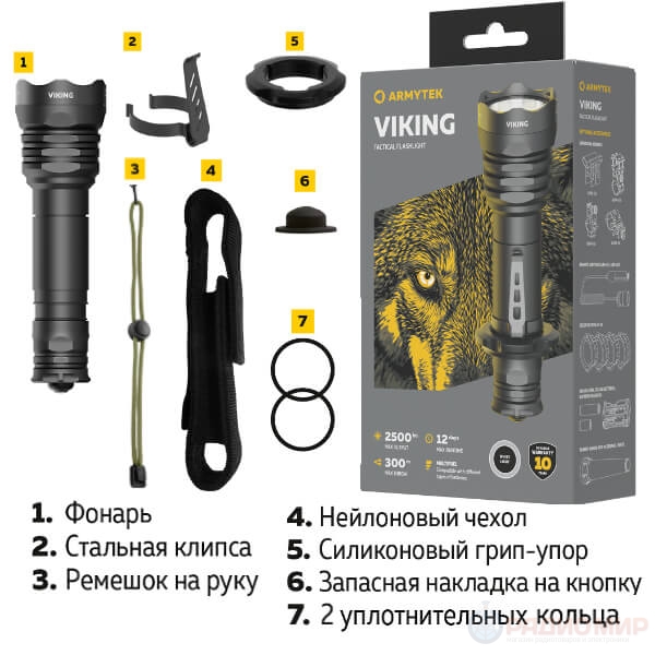Тактический фонарь Armytek Viking White: 2500 лм, дальность 300 м, до 12 дней работы. Защита IP68, ударопрочный корпус, совместимость с 18650 и CR123A.