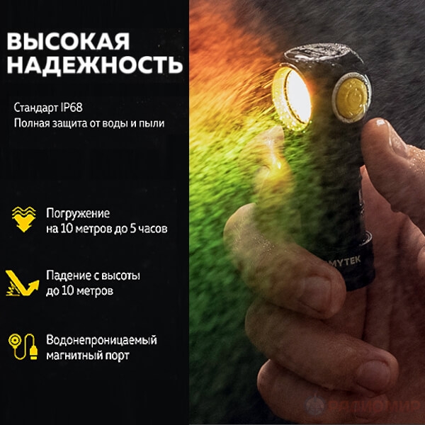 Фонарь компактный, лёгкий и невероятно удобный: магнитная USB-зарядка, аккумулятор 18350 Li-Ion в комплекте, интуитивное управление режимами, а также продуманная система уведомлений о заряде. Корпус с защитой IP68 выдерживает погружение и падения, а встроенная блокировка предотвращает случайное включение при переноске.