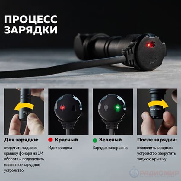 Открутите заднюю крышку на 1/4 и подключите магнитный USB-кабель. Цветовая индикация зарядки подскажет статус: красный — идёт заряд, зелёный — готово.