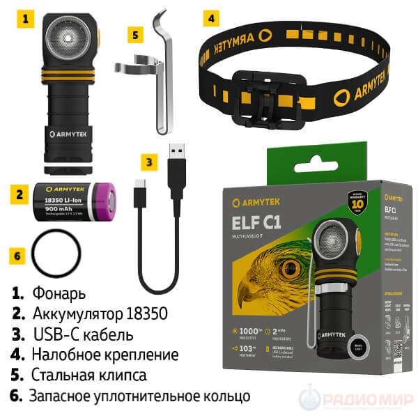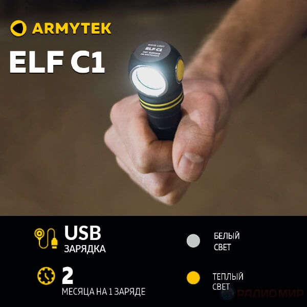 Armytek ELF C1 USB-C — компактный ультрасветлый EDC-фонарь с возможностью выбора цветовой температуры: Холодный Белый (White) или Тёплый Белый (Warm). Модель оснащена современной TIR-оптикой, обеспечивает широкое заливочное освещение 70°/120° и выдаёт до 1000 лм в версии White и до 930 лм в версии Warm. Отличается удобной USB-C зарядкой, стабильной яркостью и надёжной защитой IP68.