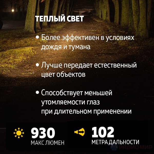 White (1000 лм, 103 м) — яркий, холодный свет с максимальной дальностью. Warm (930 лм, 102 м) — тёплый спектр, лучше работает в непогоде и даёт более естественные цвета.