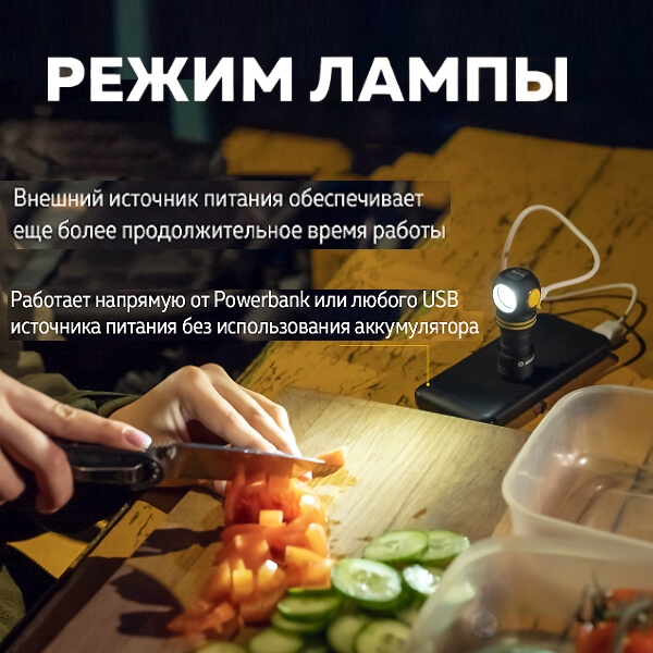 Всего 6 режимов, включая минимальный с работой до 60 суток и максимальный —52 минуты (с последующим снижением до 530/493 лм).