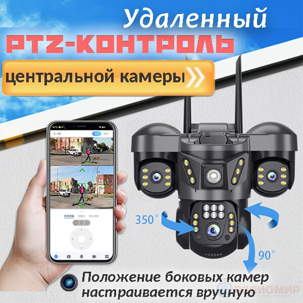 Центральная камера оснащена функцией PTZ с поворотом по горизонтали до 350° и по вертикали до 90°. Поддерживаются функции автослежения за обьектом, патрулирования по определенным позициям, выбор зон обнаружения движения и времени активности.