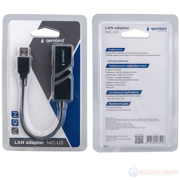 Gembird NIC-U3 — компактный адаптер, который позволяет подключить ноутбук или ПК к проводному интернету через USB 3.0. Просто вставьте — и всё работает. Поддерживает автоматическую установку драйверов (Plug & Play). Идеальное решение для устройств без встроенного LAN-порта или для замены неисправной сетевой карты.