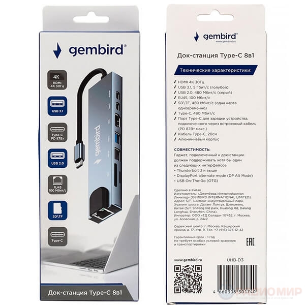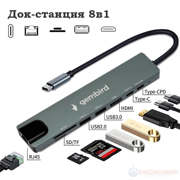Док-станция Gembird UHB-D3 8 в 1: HDMI 4K, LAN, USB 3.1, SD/TF, Power Delivery 87Вт. Превратите ноутбук в полноценную рабочую станцию всего с одним дивайсом!