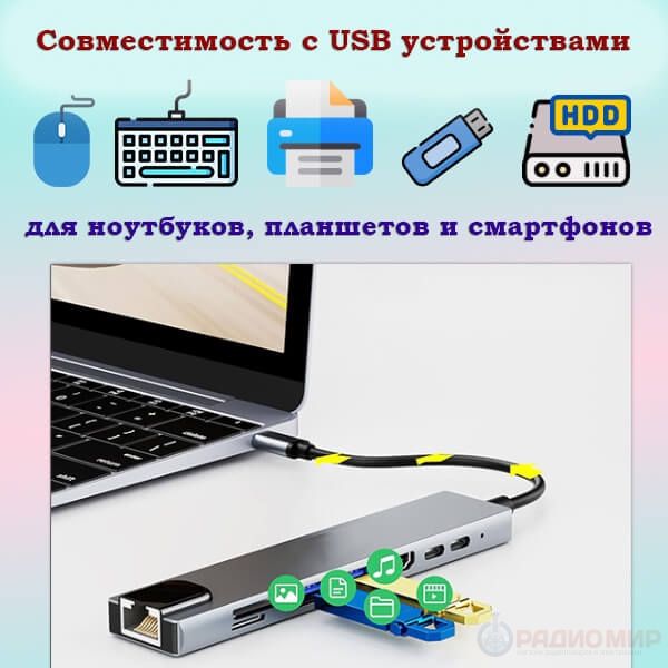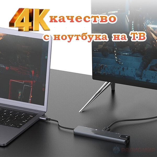 Многофункциональный хаб USB-C с поддержкой HDMI 4K, LAN, Power Delivery и кардридером SD/TF. Подходит для ноутбуков, планшетов и смартфонов с USB-C.