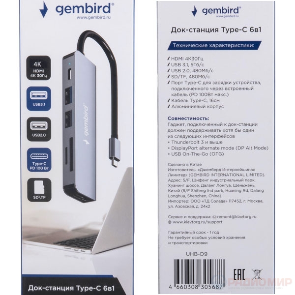 Док-станция USB-C с HDMI 4K, USB, SD/TF и Power Delivery 100 Вт UHB-D9