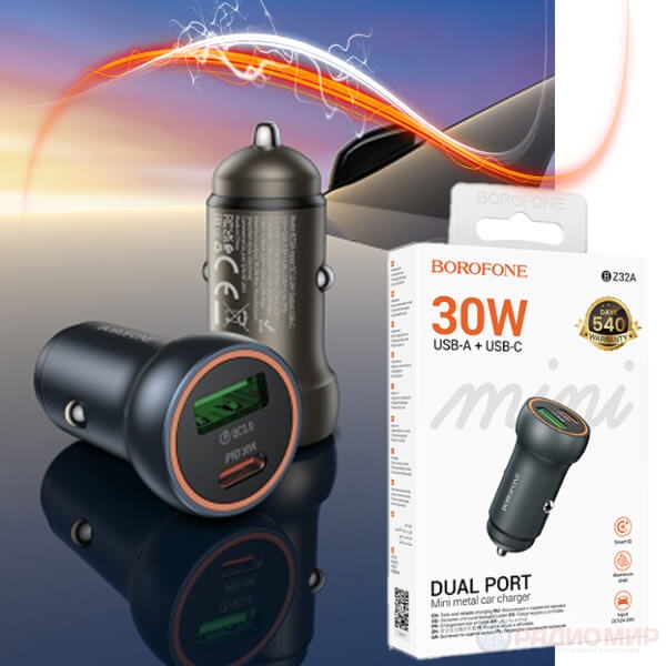 Borofone BZ32A — компактное и мощное автомобильное зарядное устройство для тех, кто ценит скорость и надёжность. Два порта: Type-C и USB-A. Поддерживает все современные стандарты быстрой зарядки и способно выдать до 30 Вт через порт Type-C. Модель идеально подходит для смартфонов, планшетов, навигаторов и даже ноутбуков с поддержкой PD.