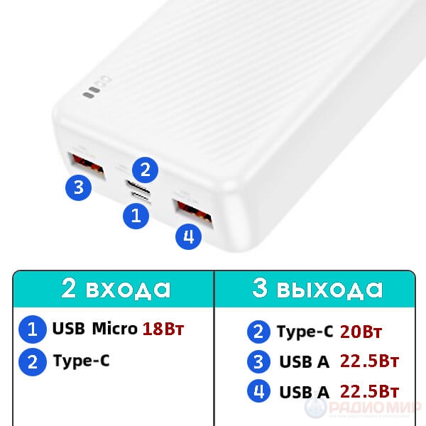 Выход Type-C: 20 Вт (5V/3A, 9V/2.22A, 12V/1.67A) - PD/QC/FCP/AFC.