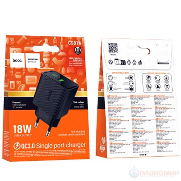 Адаптер быстрой зарядки Hoco CS81A (18W, QC3.0, LED-дисплей) — компактное и надёжное сетевое ЗУ для гаджетов, которым нужно уверенное и стабильное питание. То, что нужно для Android-смартфонов с поддержкой QC/AFC/FCP, пауэрбанков, TWS-наушников, планшетов и другой техники.
